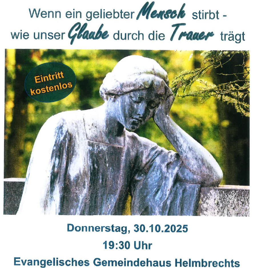 Vortrag – 30. Oktober 2025 – Wenn ein geliebter Mensch stirbt – wie unser Glaube durch die Trauer trägt 16. Oktober 2025 Allgemein Vortrag von Pfrin. Dr. Andrea Schmolke am Donnerstag, 30.10.2025 um 19.30 Uhr im evang. Gemeindehaus Helmbrechts, Schulstr. 6 – wir freuen uns auf Ihr Kommen!